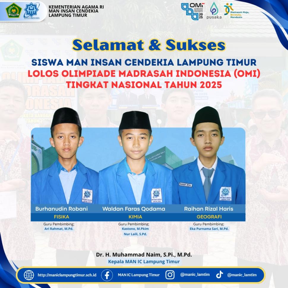 Madrasah Tiga Siswa MAN IC Lampung Timur Lolos Olimpiade Madrasah Indonesia (OMI) Tingkat Provinsi dan Melaju ke Tingkat Nasional 2025 Sabtu, 11 Oktober 2025