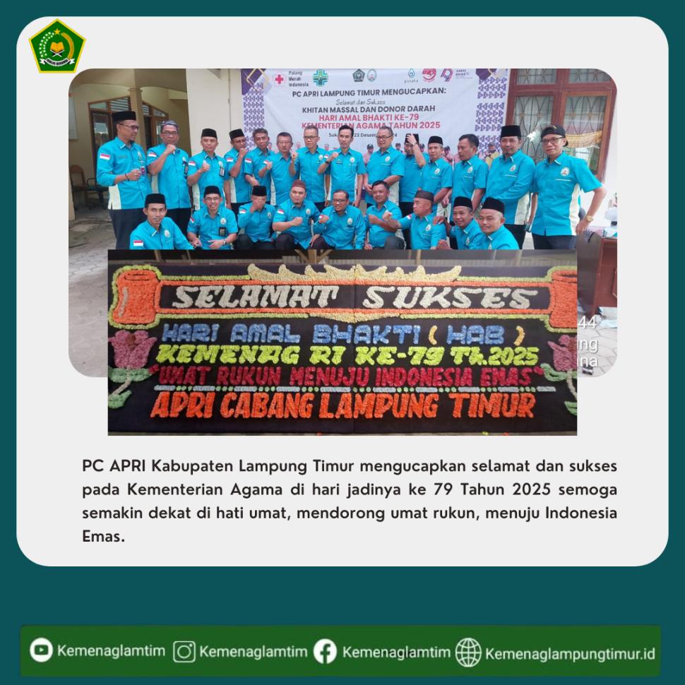Lampung Timur [Humas]– Ketua Pengurus Cabang Asosiasi Penghulu Republik Indonesia (PC APRI) Kabupaten Lampung Timur, Muhammad Ridwan, S.Ag., bersama jajaran dan anggota, mengucapkan selamat Dirgahayu Hari Amal Bakti (HAB) ke-79 Kementerian Agama Republik Indonesia.