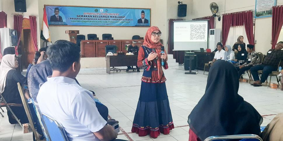 Lampung Timur (Humas) - Puluhan pasangan suami istri di Kabupaten Lampung Timur mengikuti Bimbingan Perkawinan Gerakan Keluarga Maslahat Angkatan II yang digelar Kementerian Agama Kabupaten Lampung Timur, Kamis (16/10/2025). Kegiatan yang berlangsung di Aula Kemenag ini menghadirkan Prof. Mufliha Wijayati, Guru Besar Fakultas Syariah UIN Jurai Siwo Lampung, untuk membekali para peserta tentang cara “mengasah cinta dan mencegah luka” dalam kehidupan rumah tangga agar terwujud keluarga yang sakinah, mawaddah, warahmah, dan maslahat.