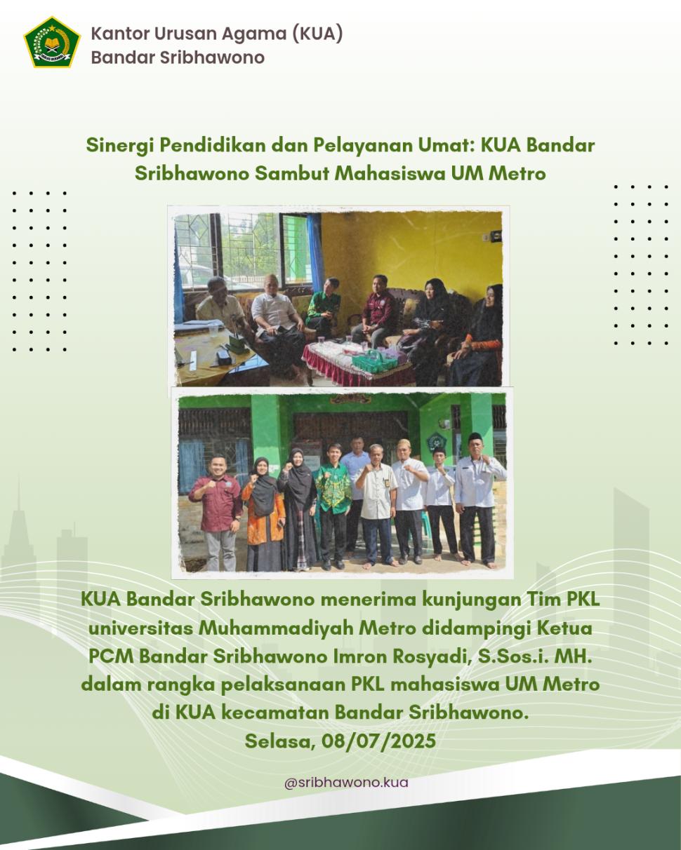 Lampung Timur Sinergi Pendidikan dan Pelayanan Umat: KUA Bandar Sribhawono Sambut Mahasiswa UM Metro Selasa, 08 Juli 2025