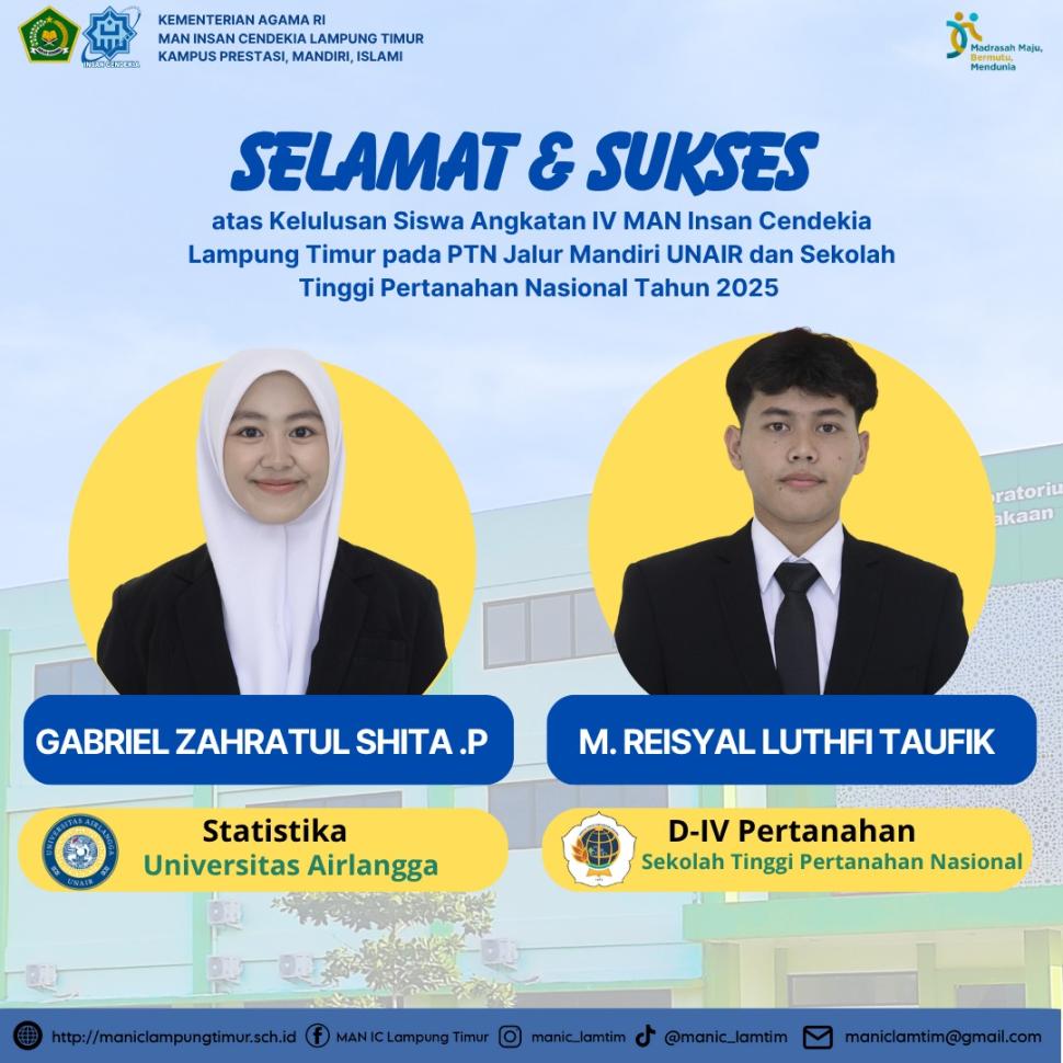 Lampung Timur Bangga! Dua Alumni MAN IC Lamtim, Gabriel dan Reisyal, Tembus UNAIR dan STPN — Ini Jalur yang Mereka Tempuh! Selasa, 08 Juli 2025