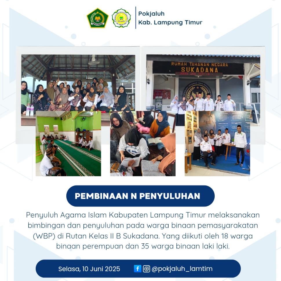 Lampung Timur Tebar Hikmah Dzulhijjah, Penyuluh Agama Islam Ajak Warga Binaan Rutan Sukadana Dekatkan Diri kepada Allah dan Sesama Selasa, 10 Juni 2025