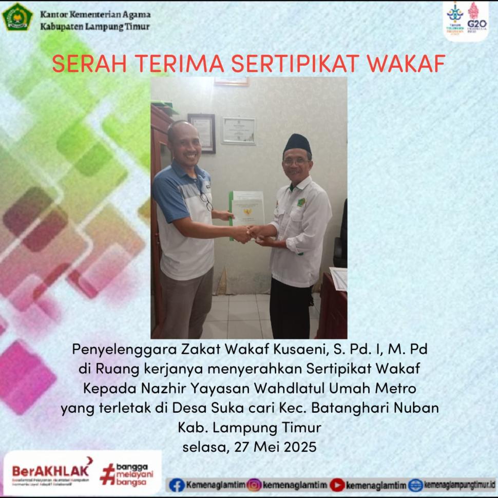 Lampung Timur Gara Zawa Serahkan Sertifikat Wakaf kepada Nazhir Yayasan Wahdlatul Ummah Metro Selasa, 27 Mei 2025