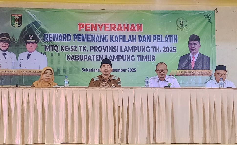 Kabupaten Semangat Qur’ani Menggema dalam Penyerahan Reward Kafilah MTQ Lampung Timur Selasa, 23 Desember 2025