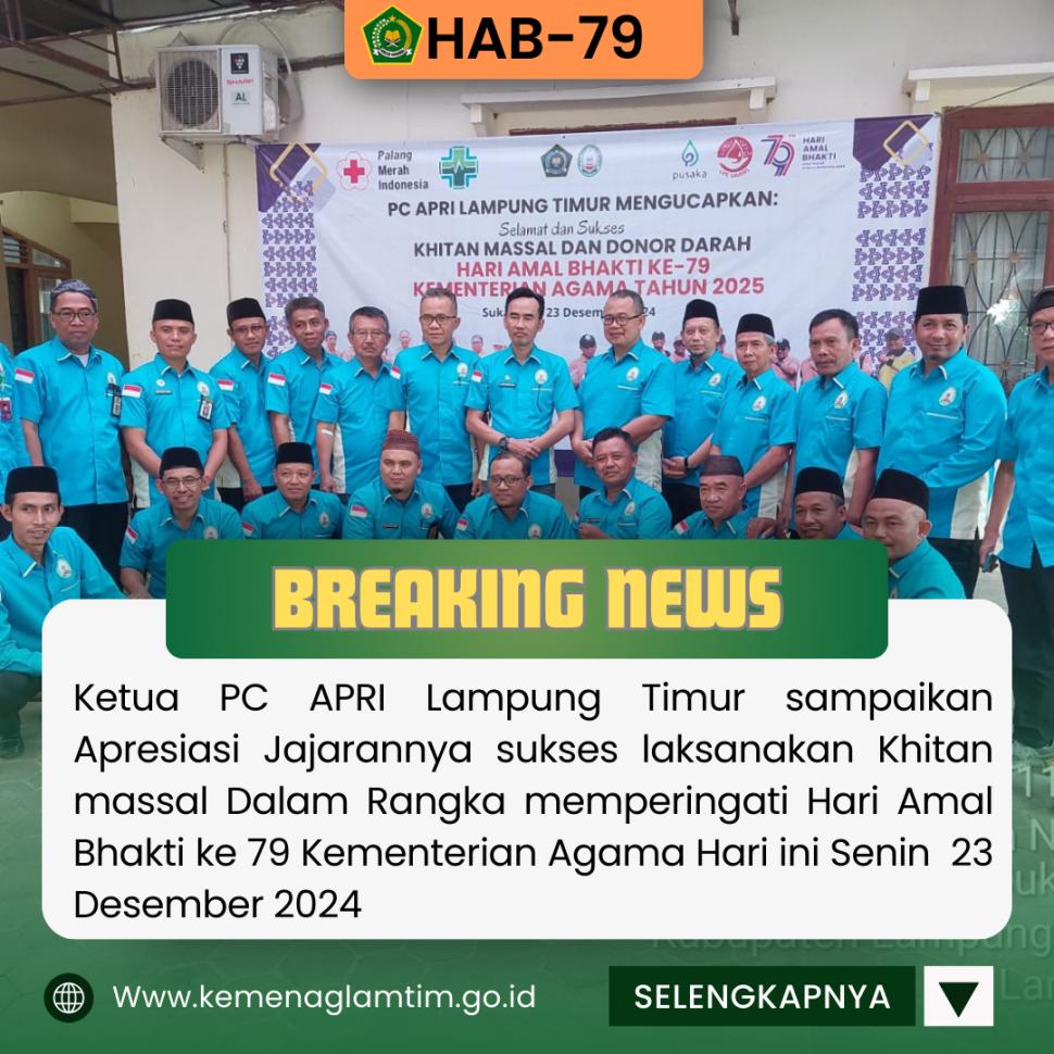 Lampung Timur Hari Amal Bhakti ke-79: PC APRI Lampung Timur Koordinator Khitan Massal, Ketua Sampaikan Apresiasi Senin, 23 Desember 2024