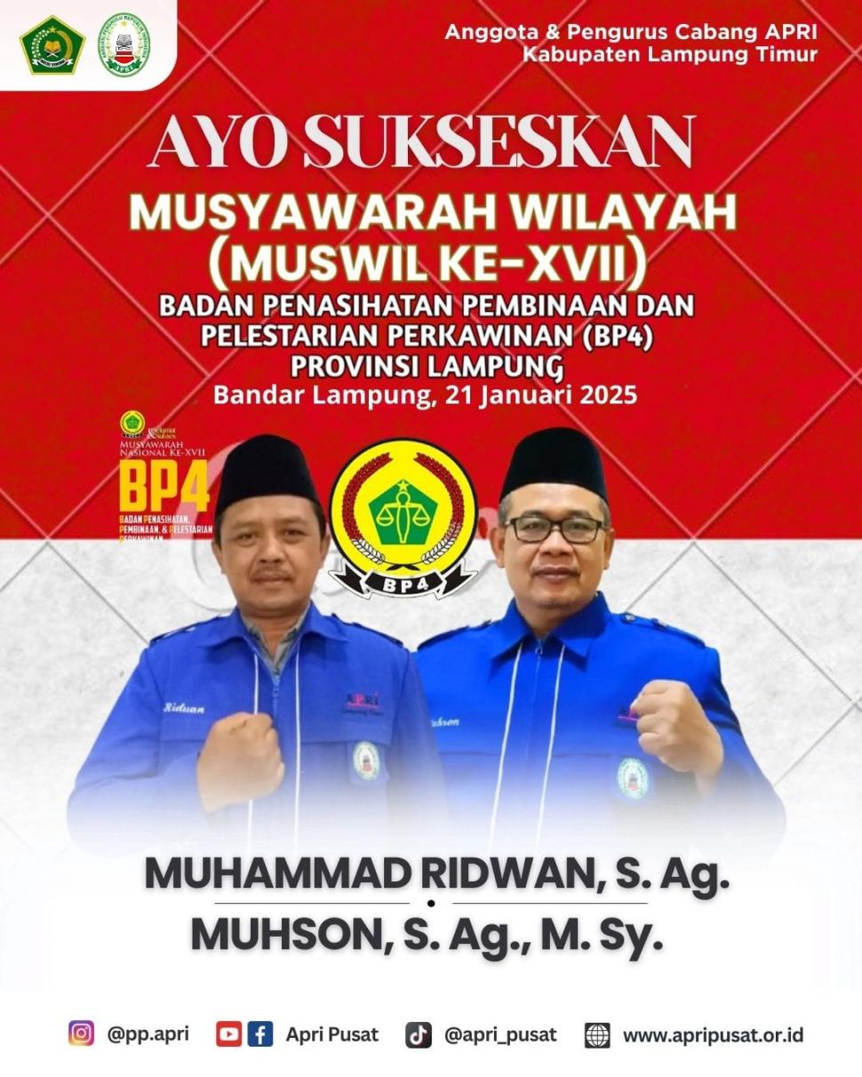 Lampung Timur Muswil BP4 XVII: PC APRI Lampung Timur Serukan Aksi Nyata Perkuat Ketahanan Keluarga Senin, 20 Januari 2025
