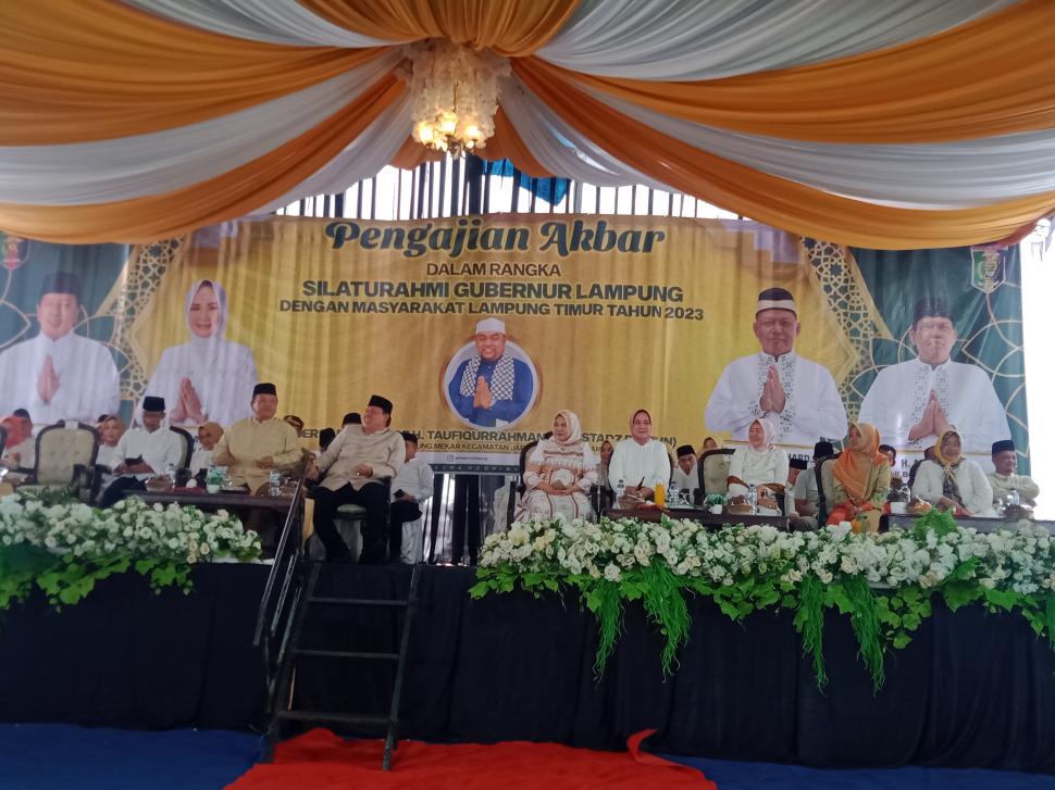 Lampung Timur Kepala Kantor Kementerian Agama Lampung Timur di wakili oleh Kepala KUA Kecamatan Jabung menghadiri Pengajian Akbar dalam rangka Silaturahmi Gubernur Lampung dengan masyarakat Lampung Timur. Senin, 04 Desember 2023