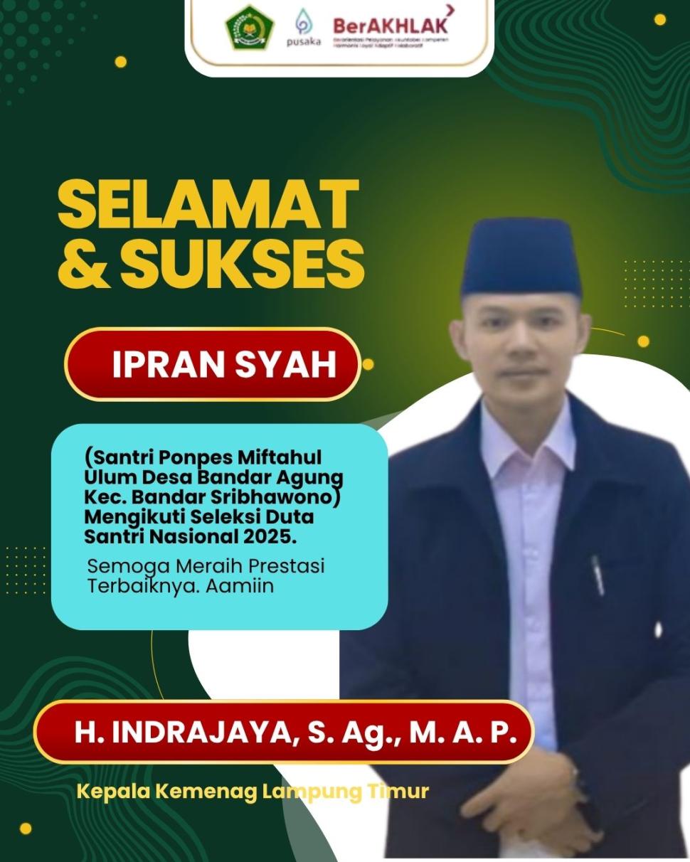 Lampung Timur Kepala Kemenag Lampung Timur Beri Dukungan Penuh untuk Santri Ikuti Seleksi Duta Santri Nasional 2025 Senin, 11 Agustus 2025