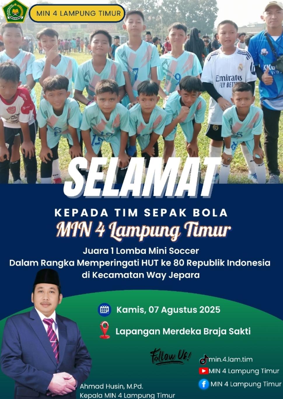 Lampung Timur Tim Solid Mampu Membawa MIN 4 Lampung TimurJuara 1 Mini Soccer Championship Kamis, 07 Agustus 2025